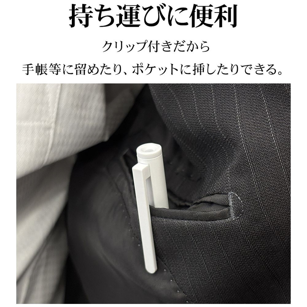 クリップが付いているので、胸ポケットに挿したり、手帳やノートに留めたりすることができます。