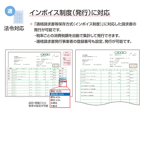 「適格請求書等保存方式(インボイス制度)」に対応した証憑の発行が可能です。