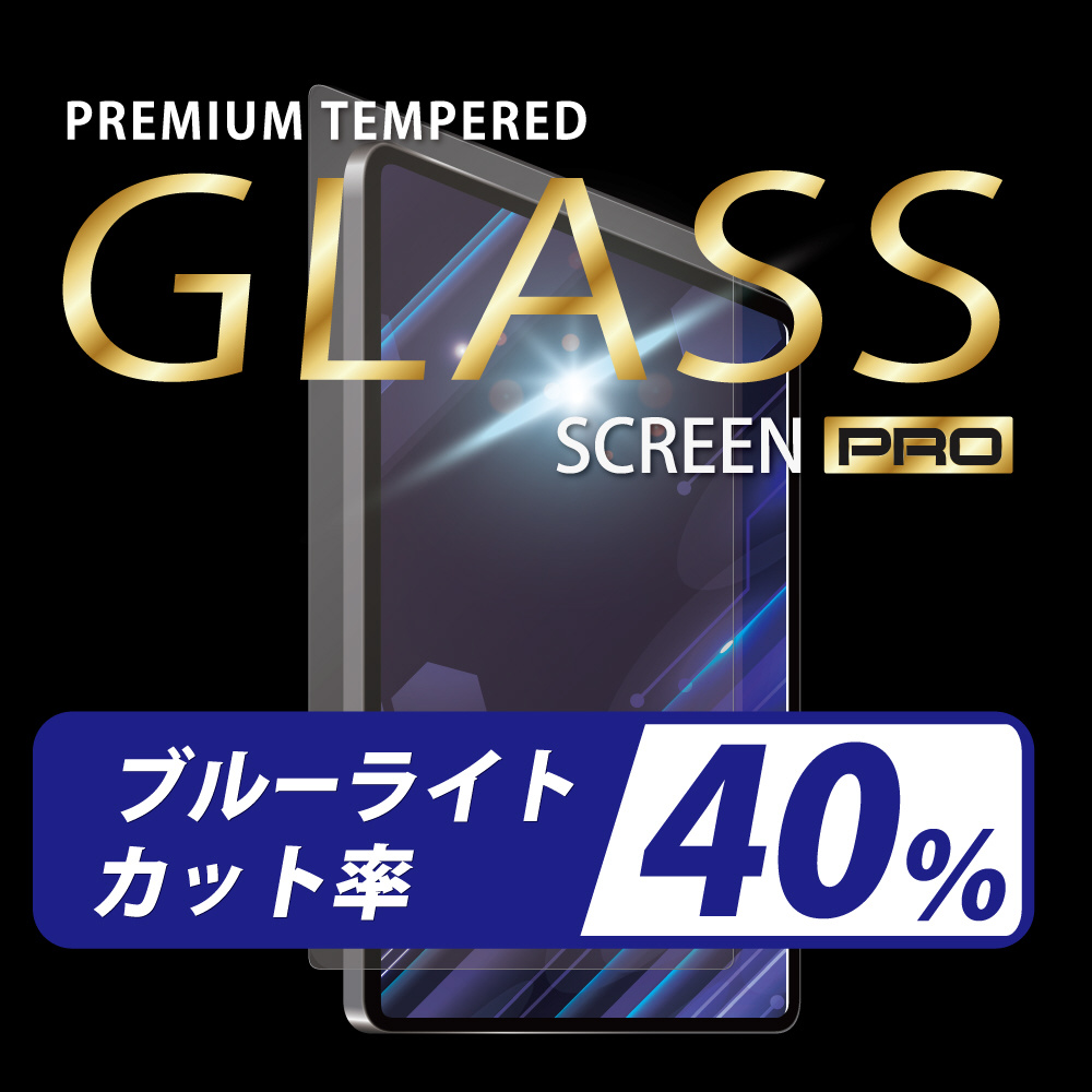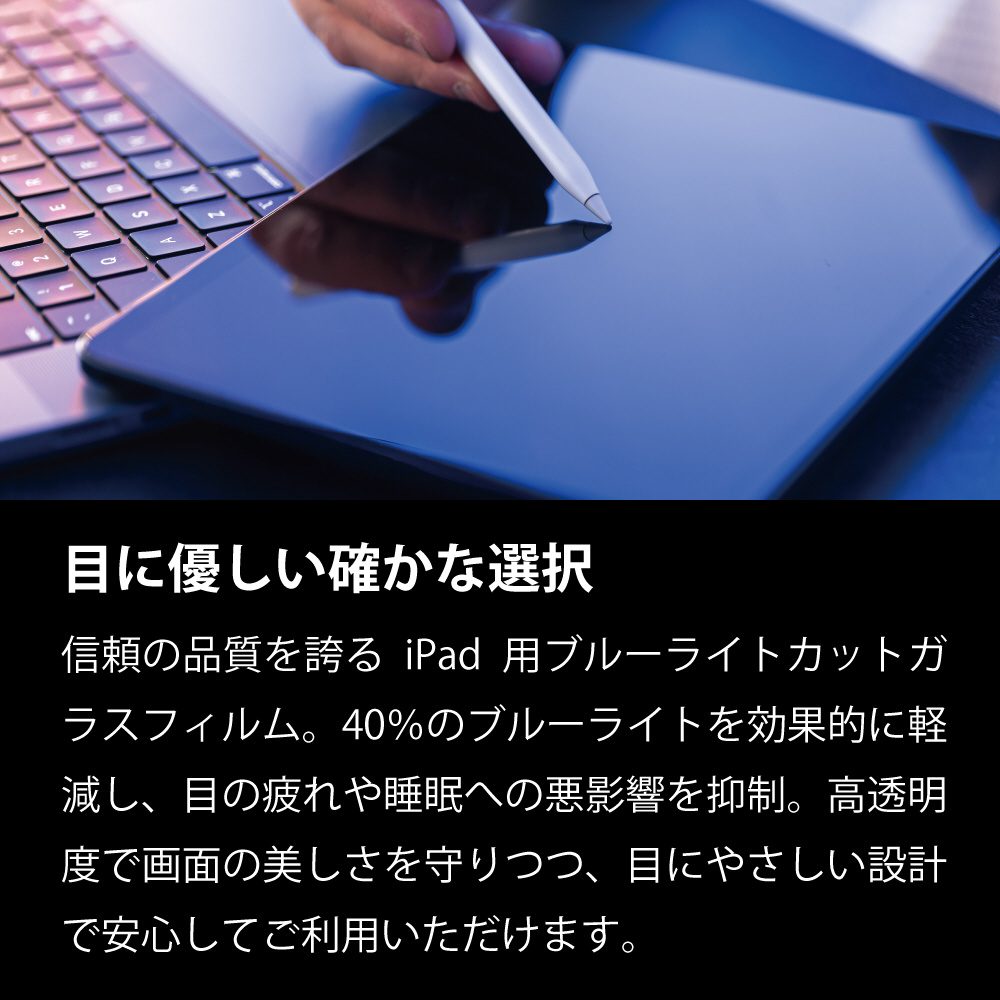 iPad用ブルーライトカットガラスフィルム。40%のブルーライトを効果的に軽減し、目の疲れや睡眠への悪影響を抑制。高透明度で画面の美しさを守りつつ、目に優しい設計で安心して使えます。