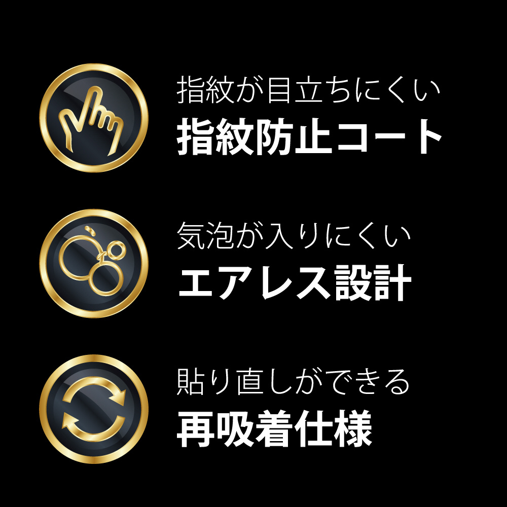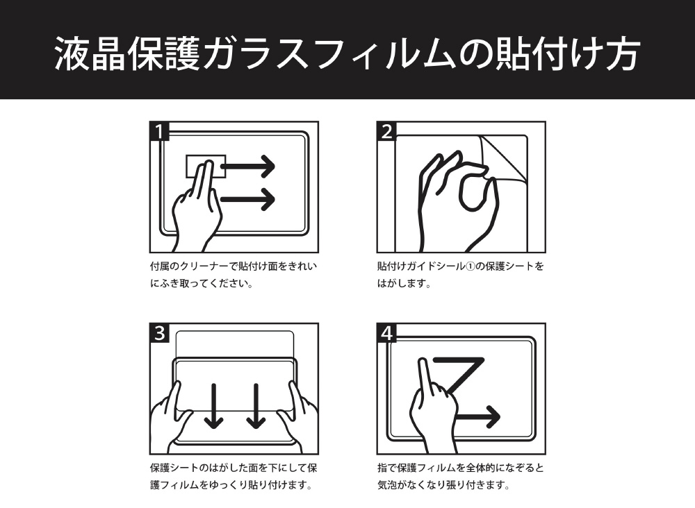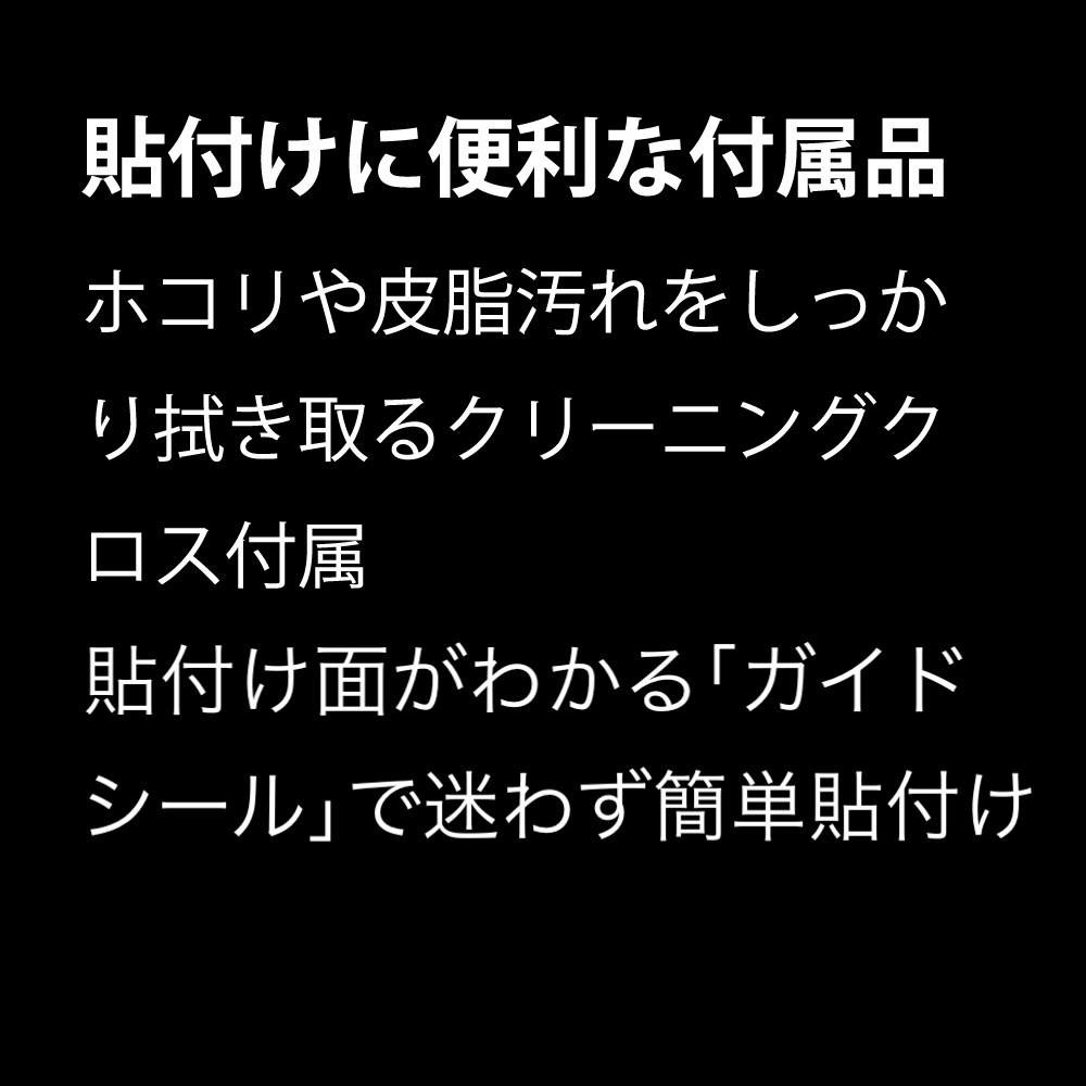 ホコリや皮脂汚れをしっかり拭き取るクリーニングクロス付属。貼付け面がわかる「ガイドシール」で迷わず簡単貼付け。