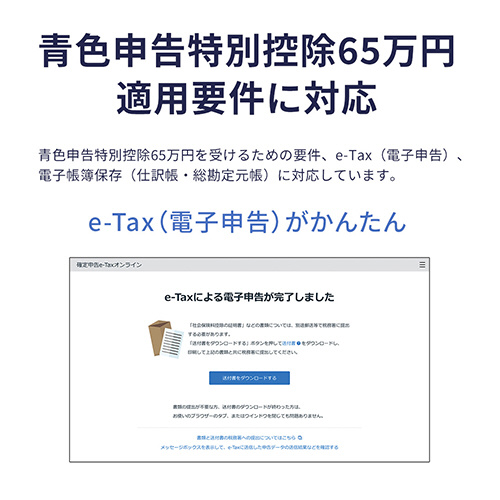 65万円の青色申告特別控除を受けるにはe-Taxによる申告(電子申告)または電子帳簿保存(仕訳帳・総勘定元帳)を行う必要があります。