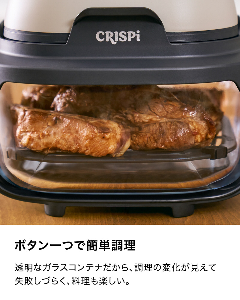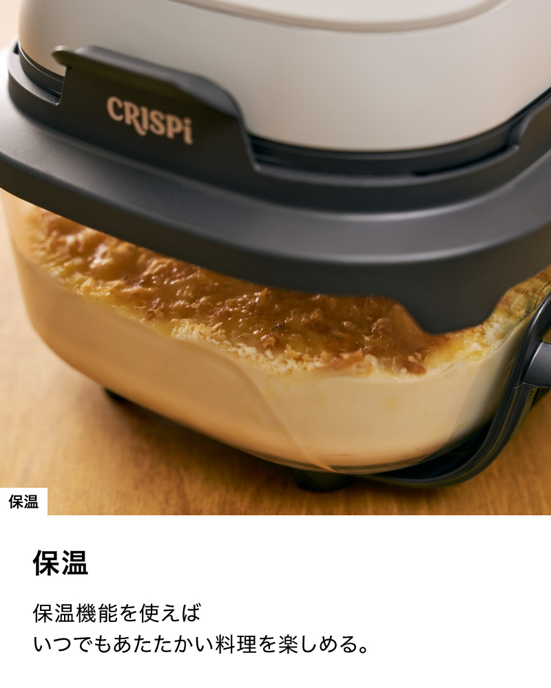 ■本体をかぶせて、クリスプ、ベイク・ロースト、リクリスプの3つから調理モードを選び、調理時間をセットすれば、あとは火加減の調整は不要でお任せ調理できるので、誰でも、手間なく、おいしい調理ができる