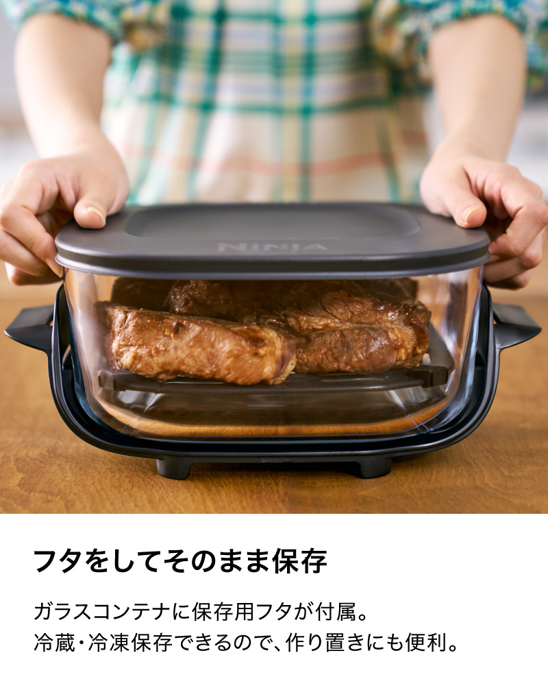 ■ガラスコンテナには保存用のフタが付属し、コンテナを重ねて積めるので、味付けや下準備をして冷蔵・冷凍保存しておけば、作り置きに便利。加熱調理もフタをして冷蔵や冷凍できるので、たくさん調理した後も保存・再加熱して食べられる