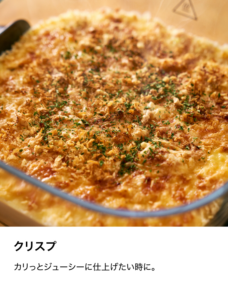 ■クリスプ、ベイク・ロースト、リクリスプの3つの調理モードにより、「クリスプ」は揚げ物がカリッとジューシーに、「ベイク・ロースト」はハンバーグや魚料理、スイーツがふっくらに、「リクリスプ」は揚げ物の温め直しに、簡単お任せで様々な料理が仕上がる
