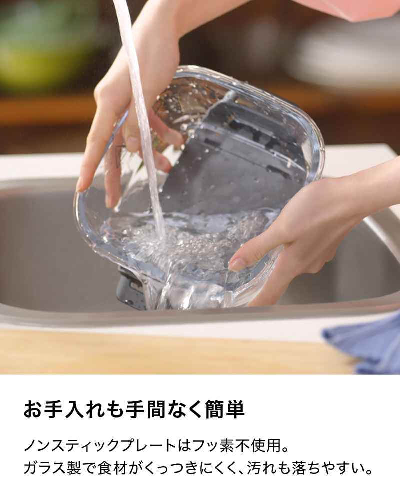 ■プレートはフッ素加工なしで安心のノンスティック加工で、焦げつきにくく、汚れが落ちやすいので洗うのも簡単