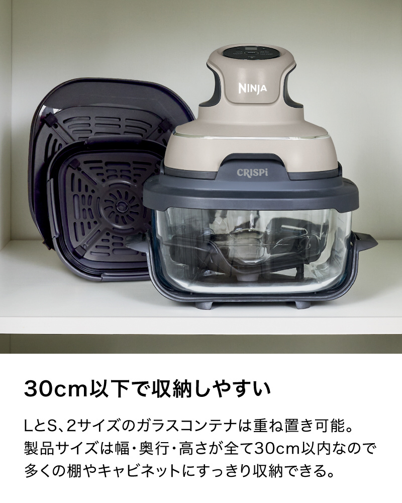 ■LとSの2サイズのガラスコンテナは重ねて収納できるので、収納もコンパクト。製品サイズは幅・奥行・高さともに30cm以内なので、多くの標準的な棚やキャビネットに収まり、収納もすっきり