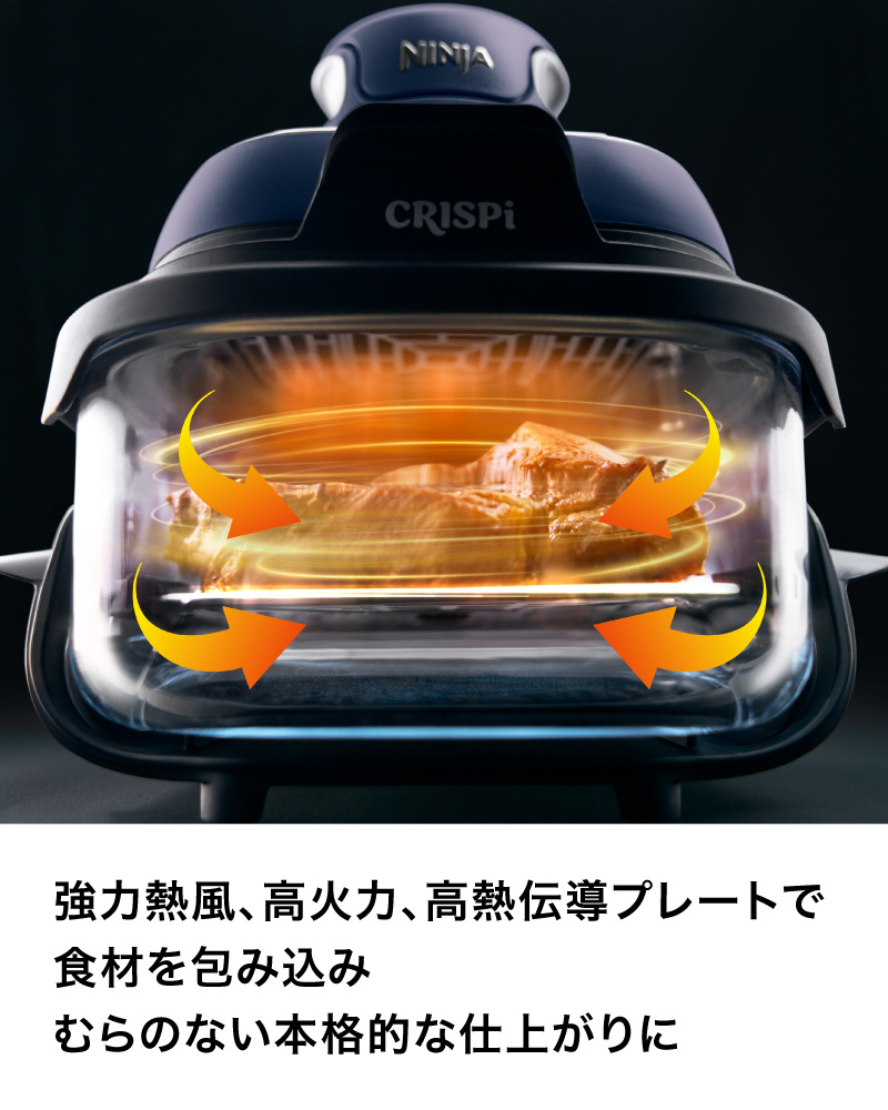 ■大型の「強力熱風ファン」、1,400Wの「高火力ヒーター」、アルミニウム製の「高熱伝導プレート」による3つの熱伝導による熱で食材を包み込むので、食材の外側はカリッと、中はジューシーに本格的な仕上がりを実現する