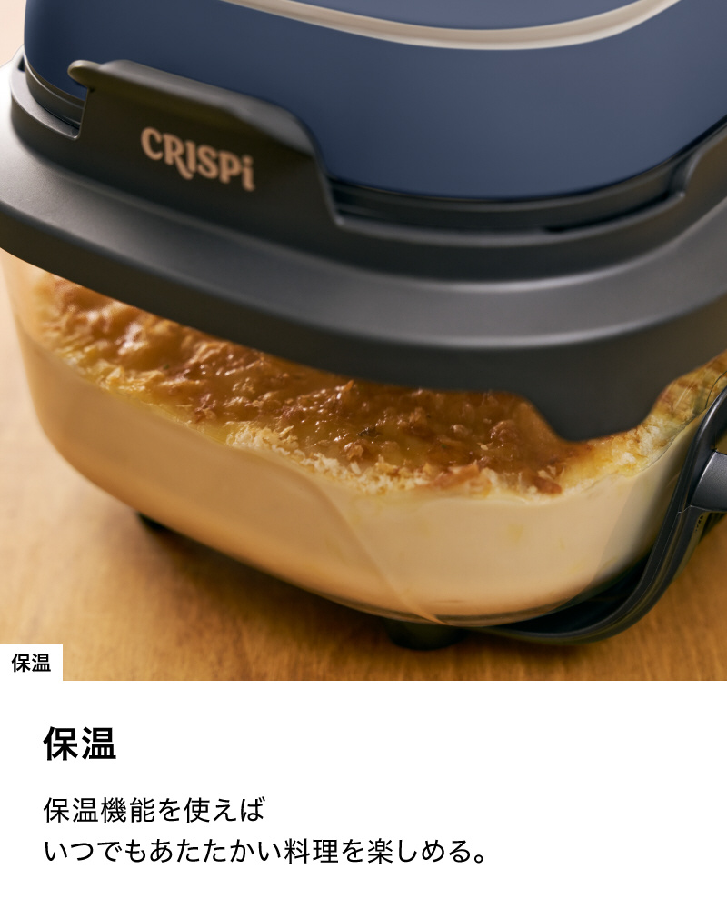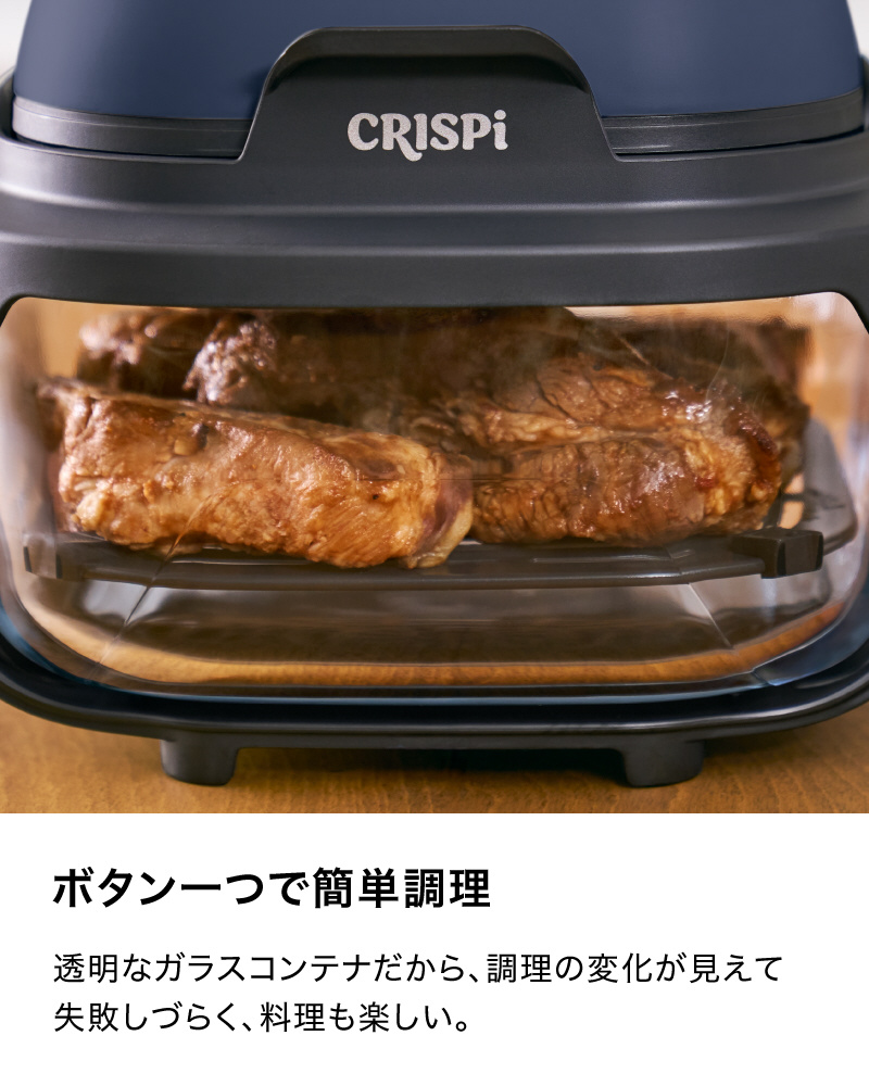 ■クリスプ、ベイク・ロースト、リクリスプの3つの調理モードにより、「クリスプ」は揚げ物がカリッとジューシーに、「ベイク・ロースト」はハンバーグや魚料理、スイーツがふっくらに、「リクリスプ」は揚げ物の温め直しに、簡単お任せで様々な料理が仕上がる