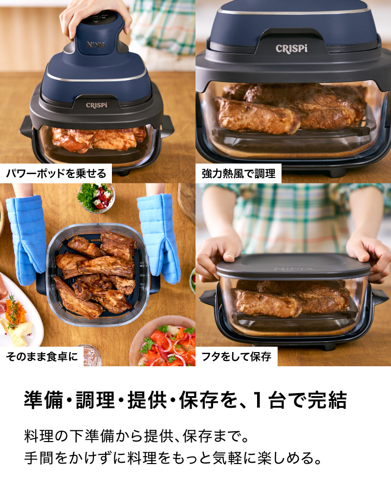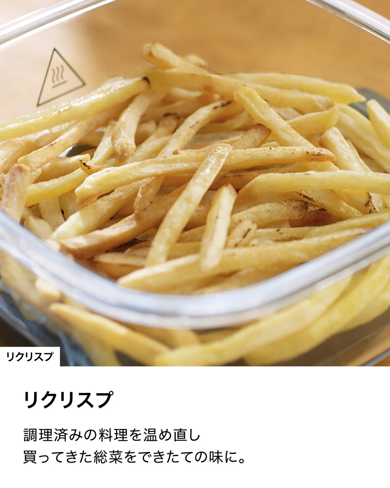 ■ガラスコンテナは電子レンジ対応なので、電子レンジによる下ごしらえとクリスピーによる調理を合わせて、さらにさまざまな料理を楽しめる
