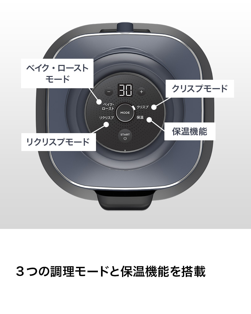 ■本体をかぶせて、クリスプ、ベイク・ロースト、リクリスプの3つから調理モードを選び、調理時間をセットすれば、あとは火加減の調整は不要でお任せ調理できるので、誰でも、手間なく、おいしい調理ができる