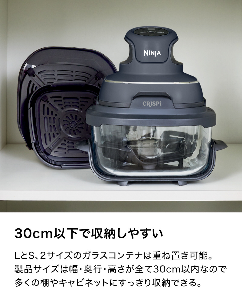 ■LとSの2サイズのガラスコンテナは重ねて収納できるので、収納もコンパクト。製品サイズは幅・奥行・高さともに30cm以内なので、多くの標準的な棚やキャビネットに収まり、収納もすっきり