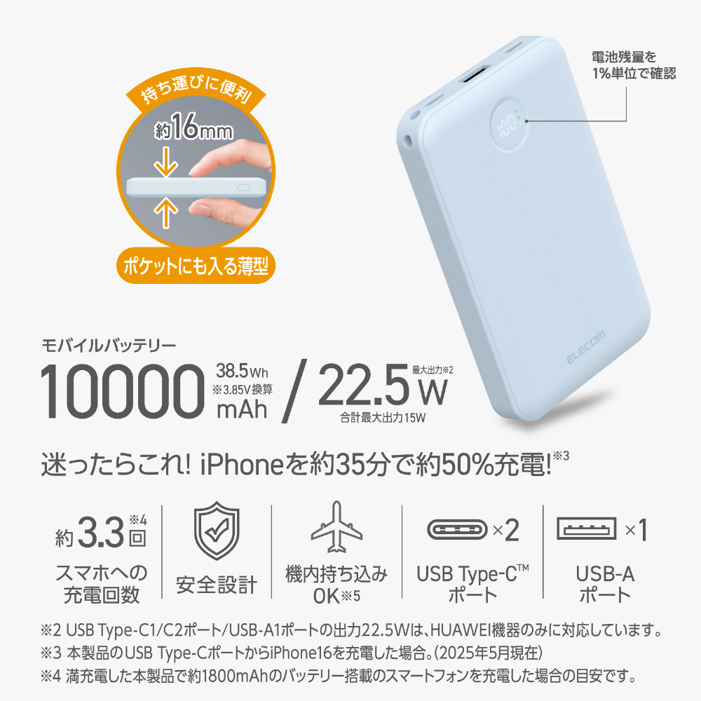 モバイルバッテリー 10000mAh 小型 軽量 22.5W充電 3ポート(Type-C×2/USB-A) 液晶残量表示 PSE適合 iPhone/Android/Switch対応 旅行 防災 ブルー DE-C76-10000BU