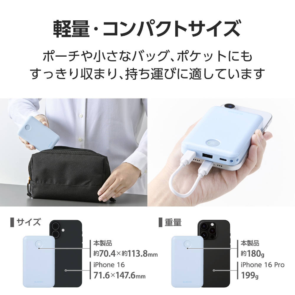 厚さ約16mmの手のひらサイズで、持ち運びに便利なモバイルバッテリーです。大容量10000mAhで、外出先でも安心して充電できます。ポーチやポケットにもすっきり収まり、手軽に持ち運び可能です。LEDパネルでバッテリー残量を1%単位で確認しながら使用できます。