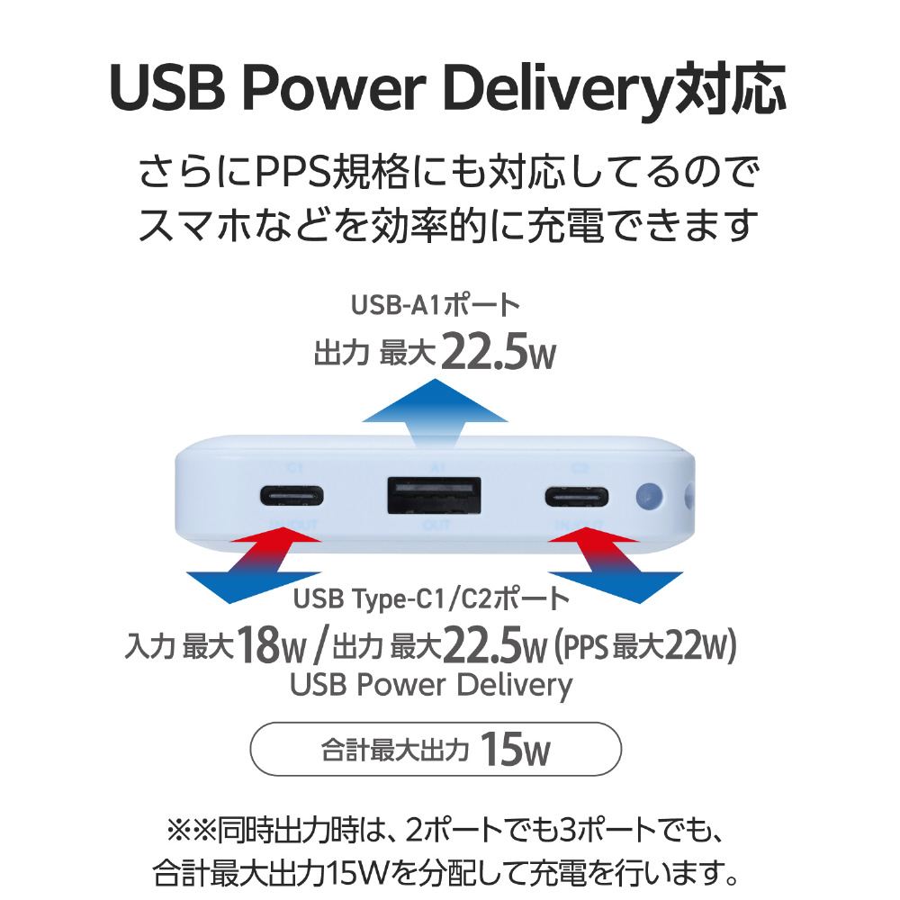 最大出力22.5Wだから、スマートフォンを高速充電可能。外出先での急な充電切れの際も安心です。