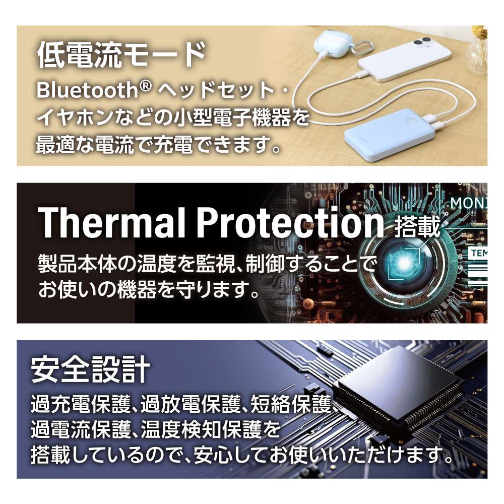 低電流モードによりBluetooth(R)ヘッドセット・イヤホンなどの小型電子機器を最適な電流で充電できます。