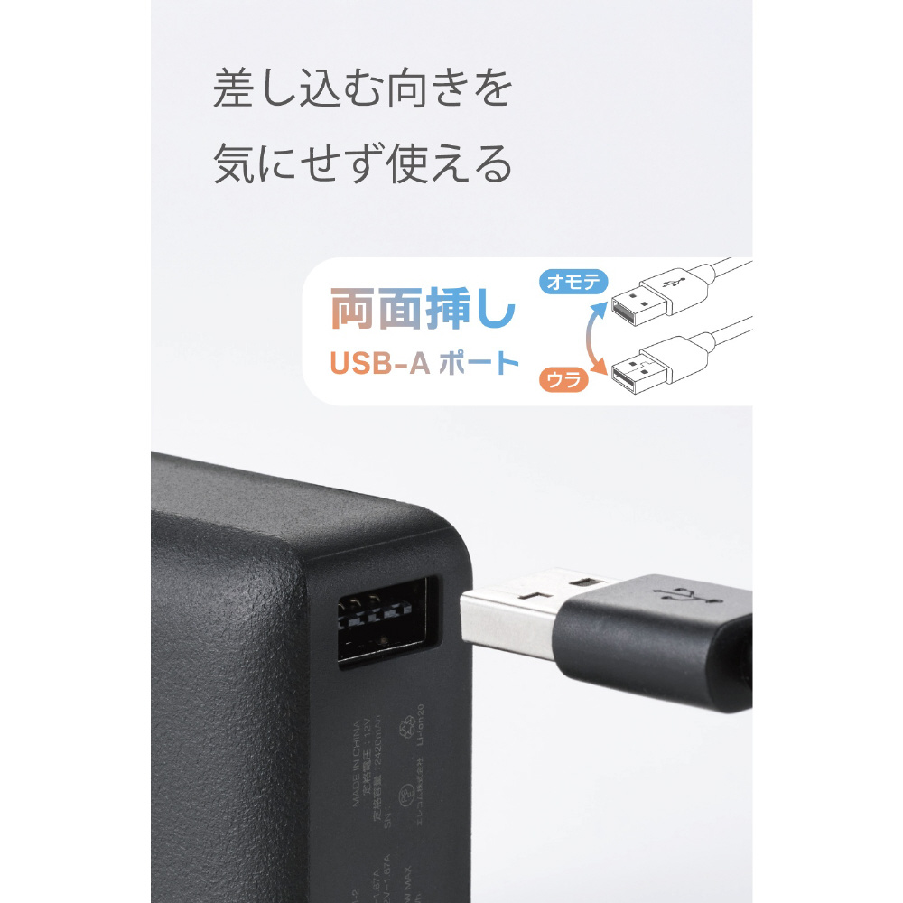 USB-AポートとUSB Type-Cポートを上下に一つずつ搭載しています。USB-Aポートは、上下の向きを気にせず挿せる両面挿しタイプです。