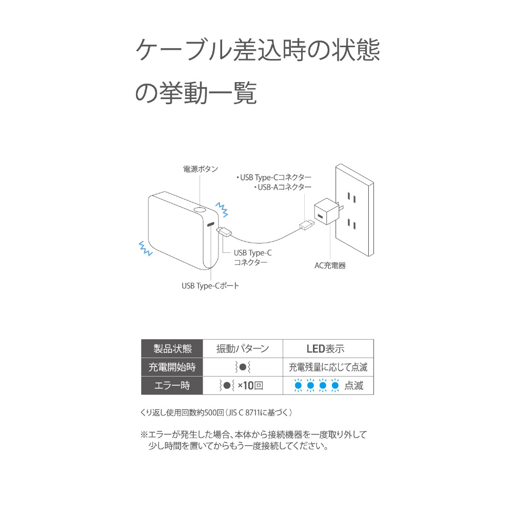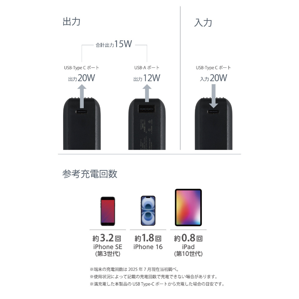 ※満充電した本製品で電源オフの状態のスマートフォンを充電する際の目安回数です。充電中に電源を入れたり、機器を使用したりしている場合は記載の数値まで充電できない場合があります。