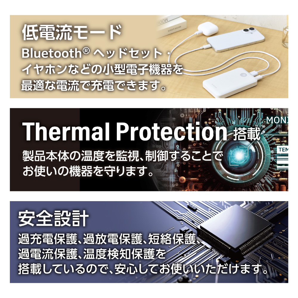 低電流モードによりBluetooth(R)ヘッドセット・イヤホンなどの小型電子機器を最適な電流で充電できます。