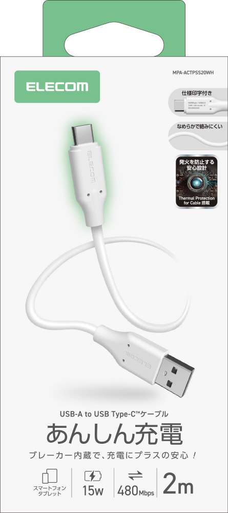 USB-A to USB Type-Cケーブル シリコン ブレーカー内蔵 最大15W 2.0m