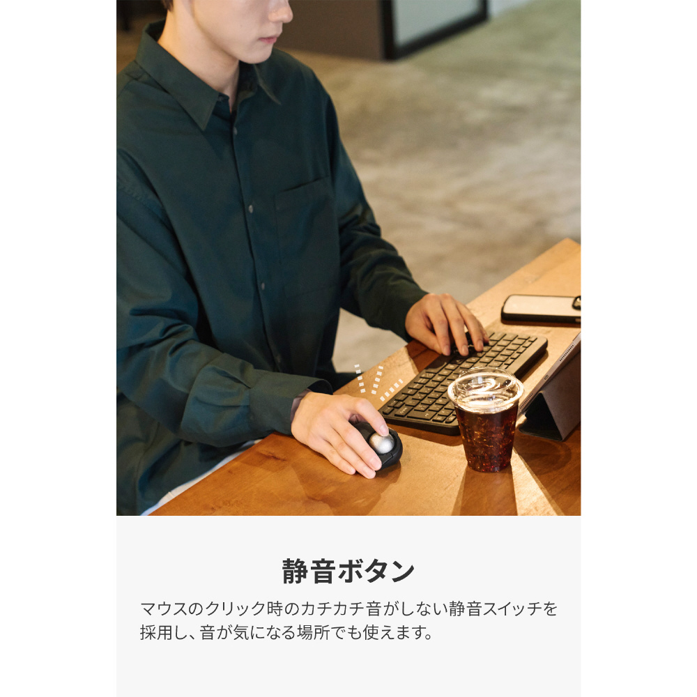 コンパクトでも機能は本格派!人差し指操作タイプの静音モバイルトラックボール“bitra”です。Bluetooth接続と無線2.4GHz接続の切り替えスイッチを搭載し、2台のデバイスをスムーズに操作可能。自宅とオフィスなどの複数環境でもストレスなく作業できます。手のひらに収まる小型設計と収納ポーチ付きで、持ち運びに便利です。