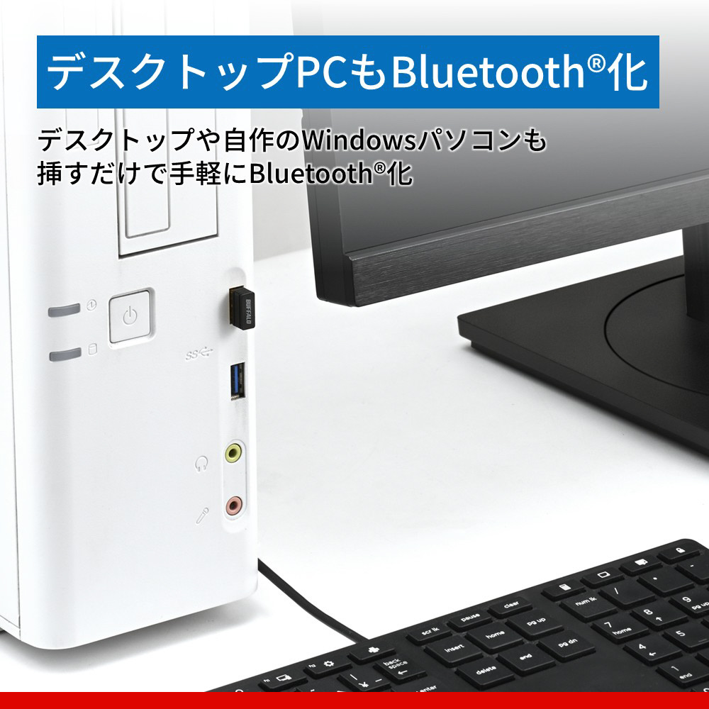 Bluetoothを搭載していないパソコンでも本商品をUSBポートに挿すだけでBluetooth機能を追加できます。ソフトウェアなどのインストールも不要です。