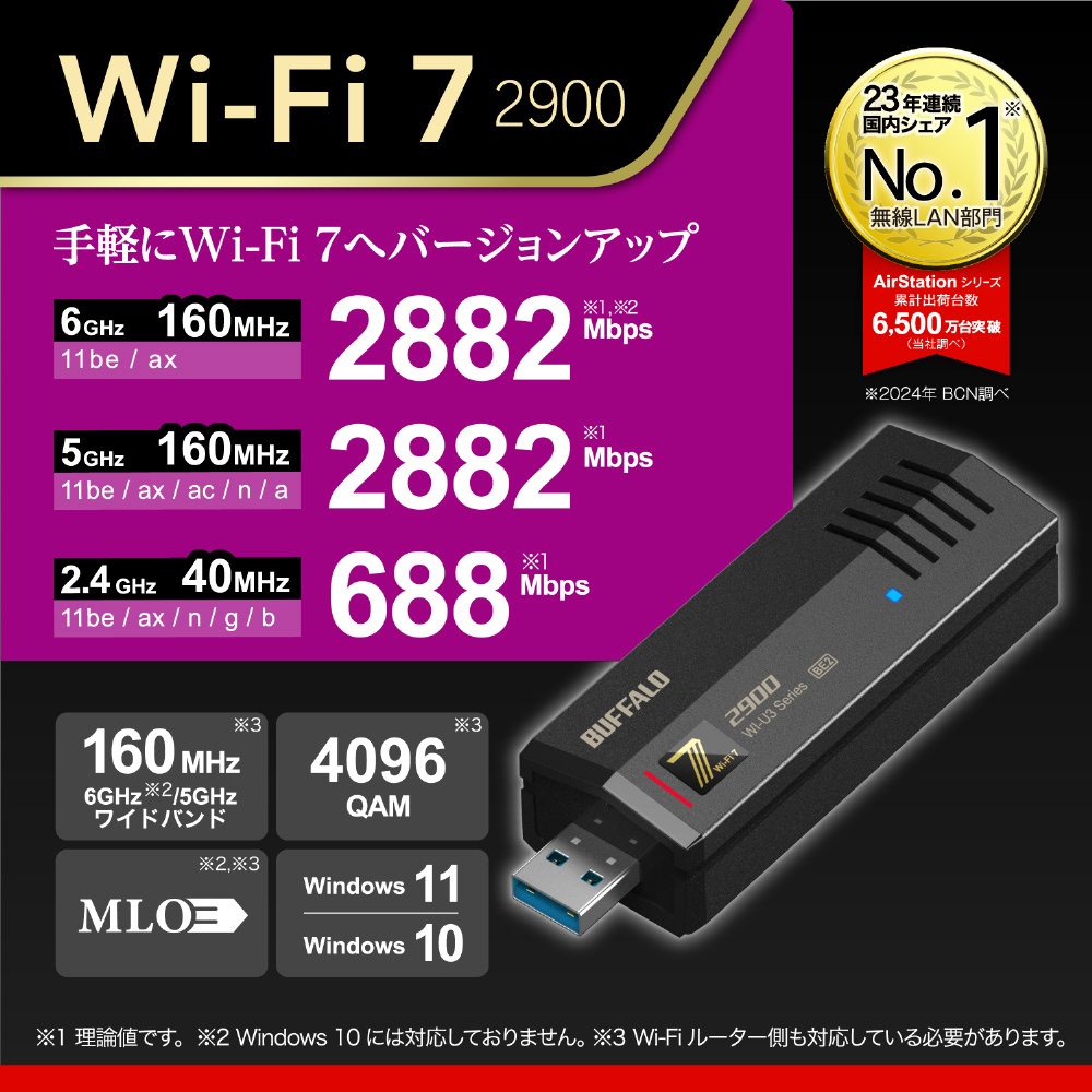 WI-U3-2900BE2 無線LAN子機 USB-A接続 2882+2882+688Mbps AirStation(Windows11対応) ブラック [Wi-Fi 7(be) /IPv6非対応]