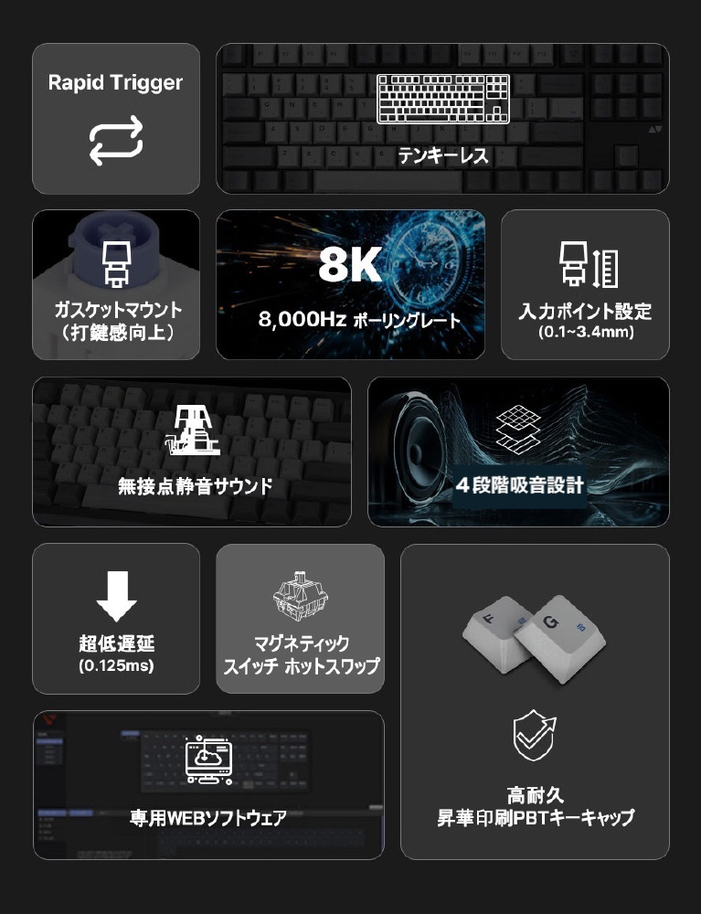 8000Hzの超高速ポーリングレートに対応し、入力遅延はわずか0.125msのハイパフォーマンス仕様。高速で正確な反応を可能にするハイエンドゲーミングキーボードです。