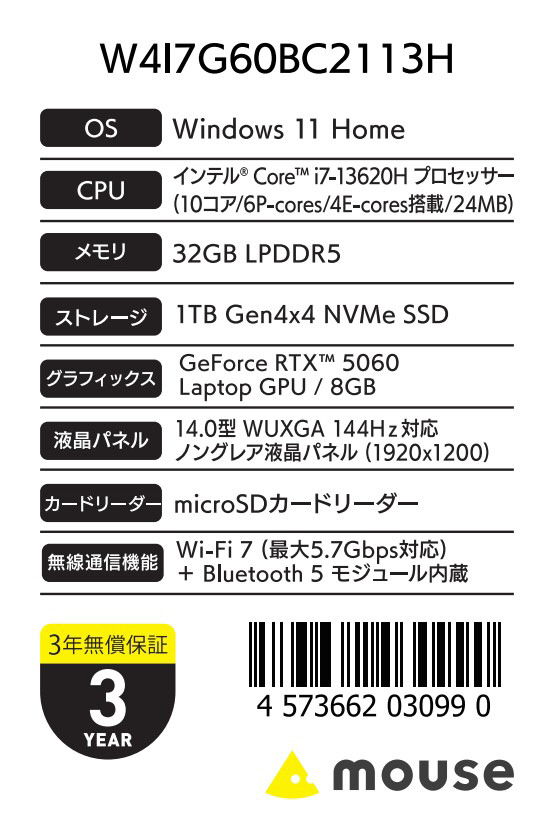 W4I7G60BC2113H ゲーミングノートパソコン G TUNE 14(RTX 5060) ブラック [14.0型 /Windows11 Home /intel Core i7 /メモリ:32GB /SSD:1TB /無し /日本語版キーボード]