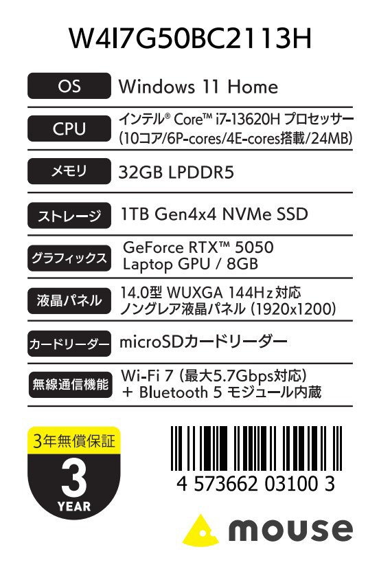 W4I7G50BC2113H ゲーミングノートパソコン G TUNE 14(RTX 5050) ブラック [14.0型 /Windows11 Home /intel Core i7 /メモリ:32GB /SSD:1TB /無し /日本語版キーボード]