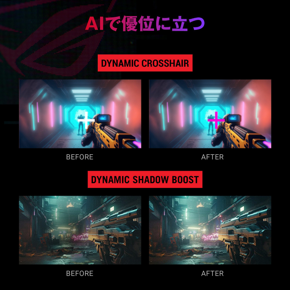 AIを搭載したGamePlusテクノロジーにより、画面上のシーンをリアルタイムで分析し、GamePlusのクロスヘアを調整して照準精度を高めます。さらに、Dynamic Shadow Boostが、明るい部分の露出を過剰にすることなく暗い部分を明るくし、低照度環境においても圧倒的な優位性を提供します。
