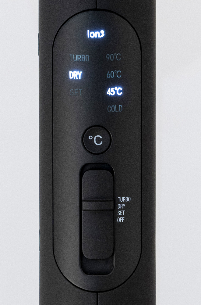 風量(SET・DRY・TURBO)と風温(COLD・45℃・60℃・90℃)の組み合わせで、全12モードを搭載。コントロールを2つに分けており、それぞれワンタッチで切り替えが可能です。「大風量=低温」の常識を覆す、最高温度90℃を実現し、どの風量に設定しても表示される風温になるように設計。風量を上げると温度が低くなってしまう問題を解決し、高温×大風量はもちろん、低温×大風量や低温×低風量など、髪質や目的に合わせてカスタマイズができます。