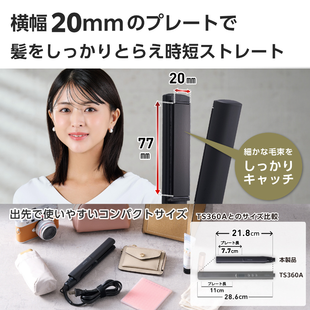 コンパクトでも髪をしっかりとらえる横幅20mmのプレートで時短ストレート。ストレートはもちろん、毛先ワンカールもできます。トップ立ち上げ、寝癖直しや毛先のニュアンスカールなどにもおすすめです。