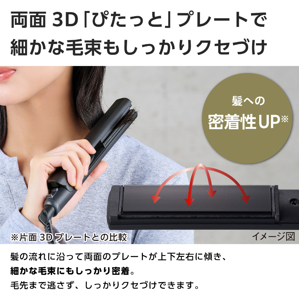 両面3D「ぴたっと」プレートを搭載し、髪の流れに沿って両面のプレートが上下左右に傾いて、細かな毛束にもしっかり密着。毛先まで逃さず、しっかりキャッチして整えます。