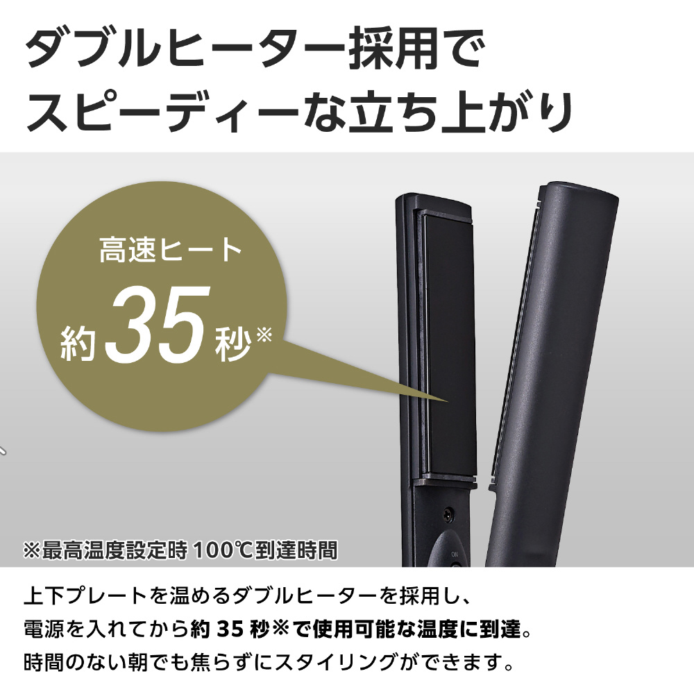 上下プレートを温めるダブルヒーターを採用し、電源を入れてから約35秒で使用可能な温度に到達。スピーディーな立ち上がりで、時間のない朝でも焦らずにスタイリングできます。 ※最高温度設定時の100℃到達時間