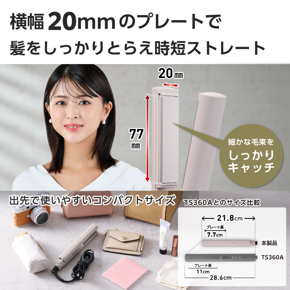 コンパクトでも髪をしっかりとらえる横幅20mmのプレートで時短ストレート。ストレートはもちろん、毛先ワンカールもできます。トップ立ち上げ、寝癖直しや毛先のニュアンスカールなどにもおすすめです。