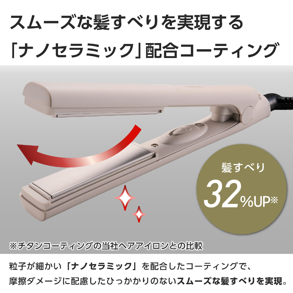 すべりやすさ32%UP!粒子が細かい「ナノセラミック」を配合したコーティングで、摩擦ダメージに配慮した、ひっかかりのないスムーズな髪すべりを実現します。 ※チタンコーティングの当社ヘアアイロンとの比較