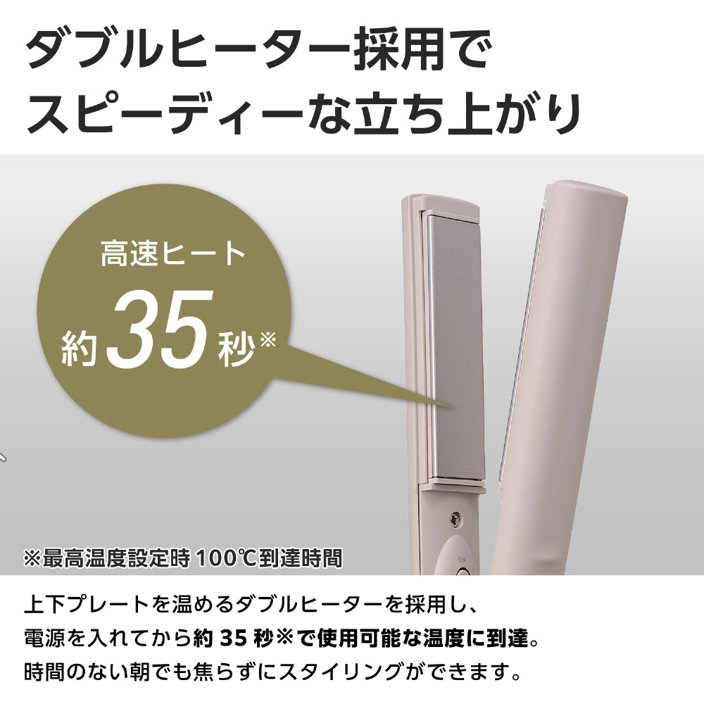 上下プレートを温めるダブルヒーターを採用し、電源を入れてから約35秒で使用可能な温度に到達。スピーディーな立ち上がりで、時間のない朝でも焦らずにスタイリングできます。 ※最高温度設定時の100℃到達時間