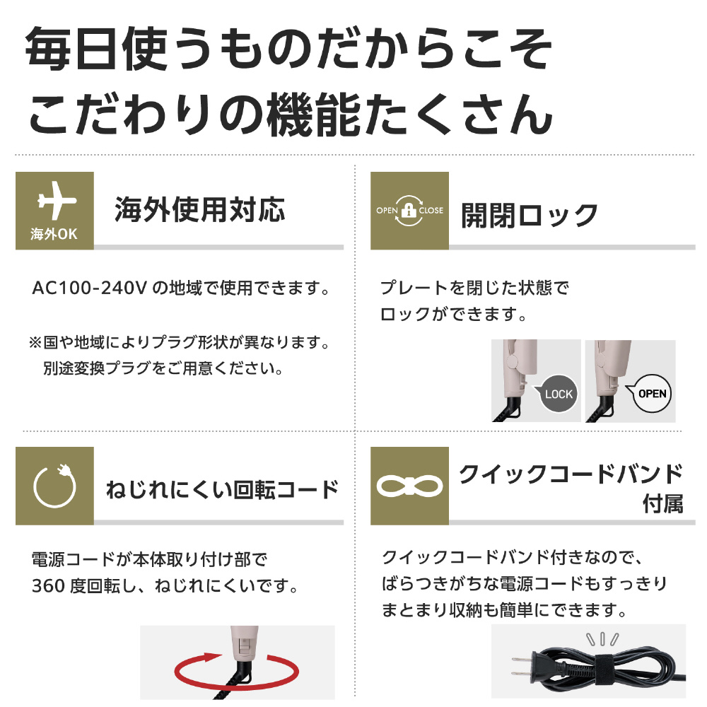 コンパクトでも実力派!最高温度190℃で本格スタイリングができるミニストレートアイロンです。ナノセラミックコーティングで摩擦ダメージを軽減しながら、両面3D「ぴたっと」プレートが髪をしっかりキャッチして、ストレートはもちろん、毛先カールや寝癖直しも思いのまま。海外対応で旅行にも便利です。