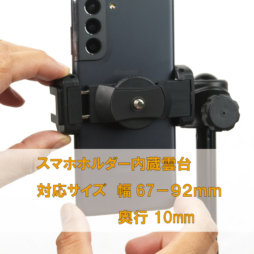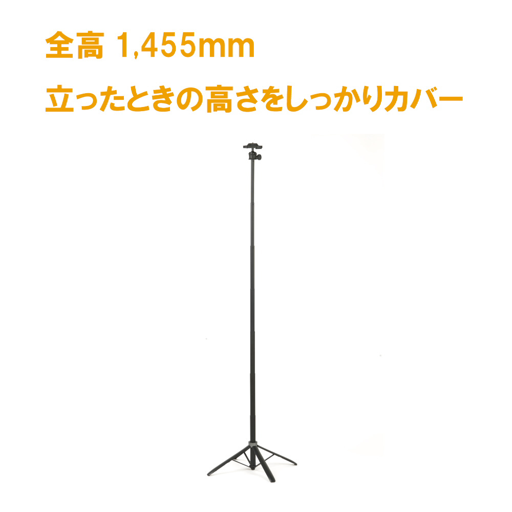 スタンドポッド 、テーブル三脚、 ライトスタンド などに 使える、多機能スタンド。自由雲台部分にはスマホホルダーを組み込んでおり、そのままスマートフォンを取り付けて撮影できます。ポール部分はフリクション(摩擦力で固定)によるフリーストップ式で、任意の高さに調整可能。縮長320mmでA4判の対角線よりも短くでき、全高は1455mmと目の高さを十分カバー。