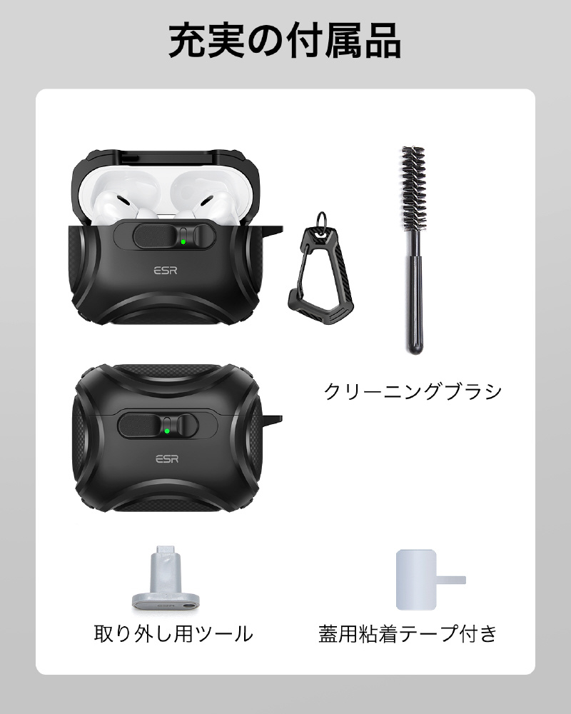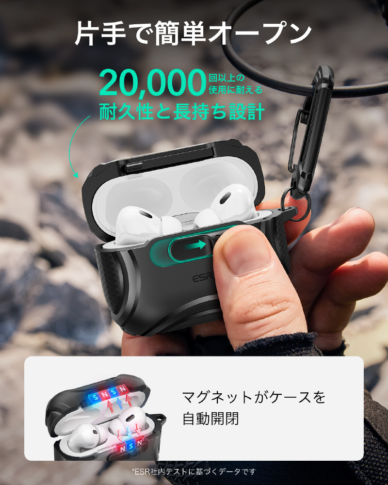 磁気吸着式の蓋とMagSafe対応の充電が可能な超タフなスライド開閉式 AirPods Proケースです。