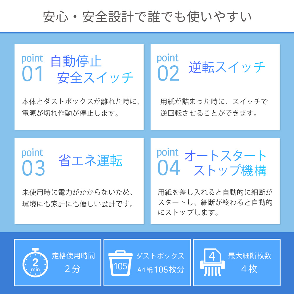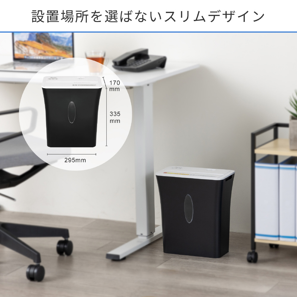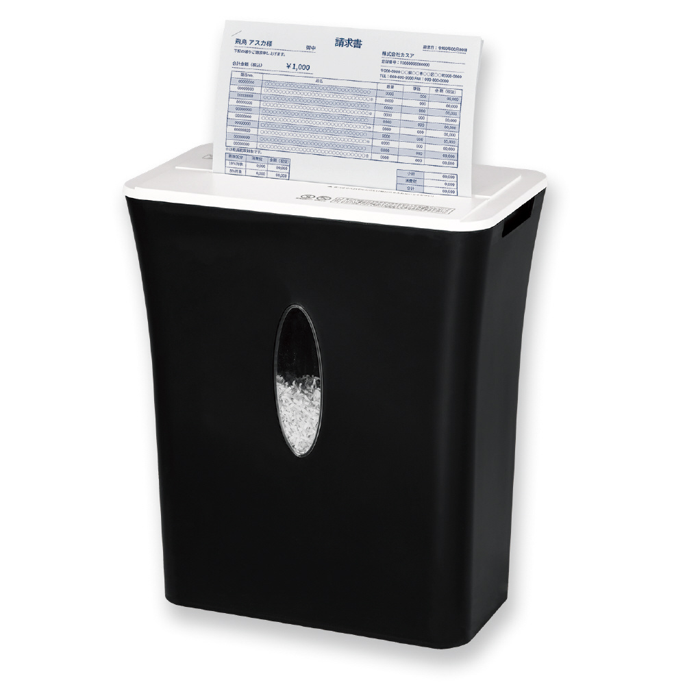 A4コピー用紙1枚わずか6〜7秒間!待機電力0W、消費電力120Wで効率よく細断