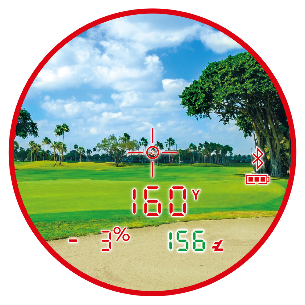 ピンフラッグなど細い目標物測定時にピンシーカー機能が作動した際、本体がビビッと振動。同時に視界上にレッドリングが発行。測定完了を瞬時に視覚、体感で把握できる便利な機能。