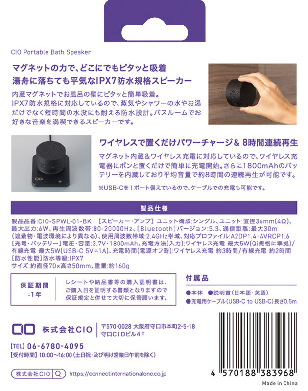 毎日のバスタイムが楽しくなる、ワイヤレス充電対応、IPX7防水規格スピーカー