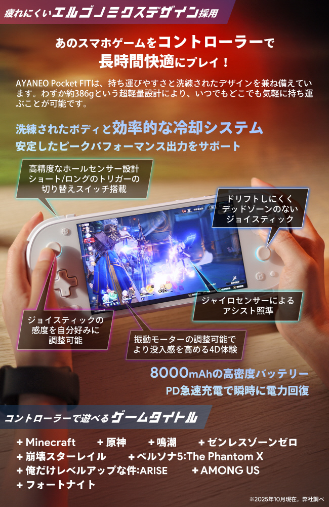 AYANEO Pocket FITは、持ち運びやすさと洗練されたデザインの両立を目指しました。本体重量は386gで、気軽に持ち運ぶことが可能です。
