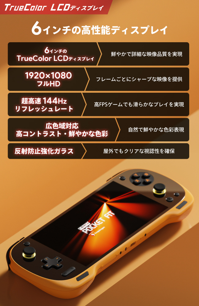 6インチのTrueColor LCDディスプレイを採用し、1080Pの高解像度と144Hzの超高速リフレッシュレートにより、滑らかで鮮明な映像体験を提供します。