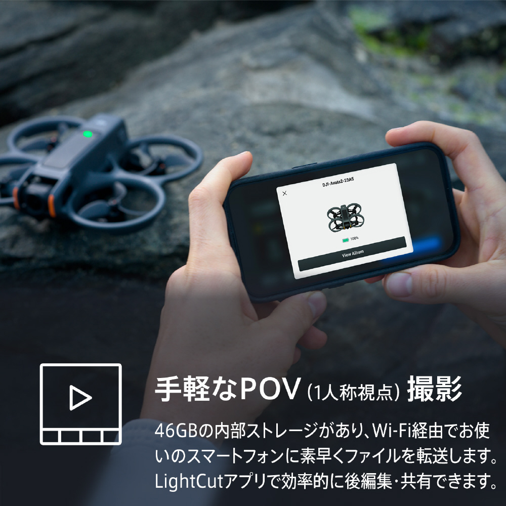 Avata 2は、46GBの内部ストレージを搭載し、1080p/60fpsなら約90分間の動画を保存でき、各飛行でのベストな瞬間を取り逃すことはありません。