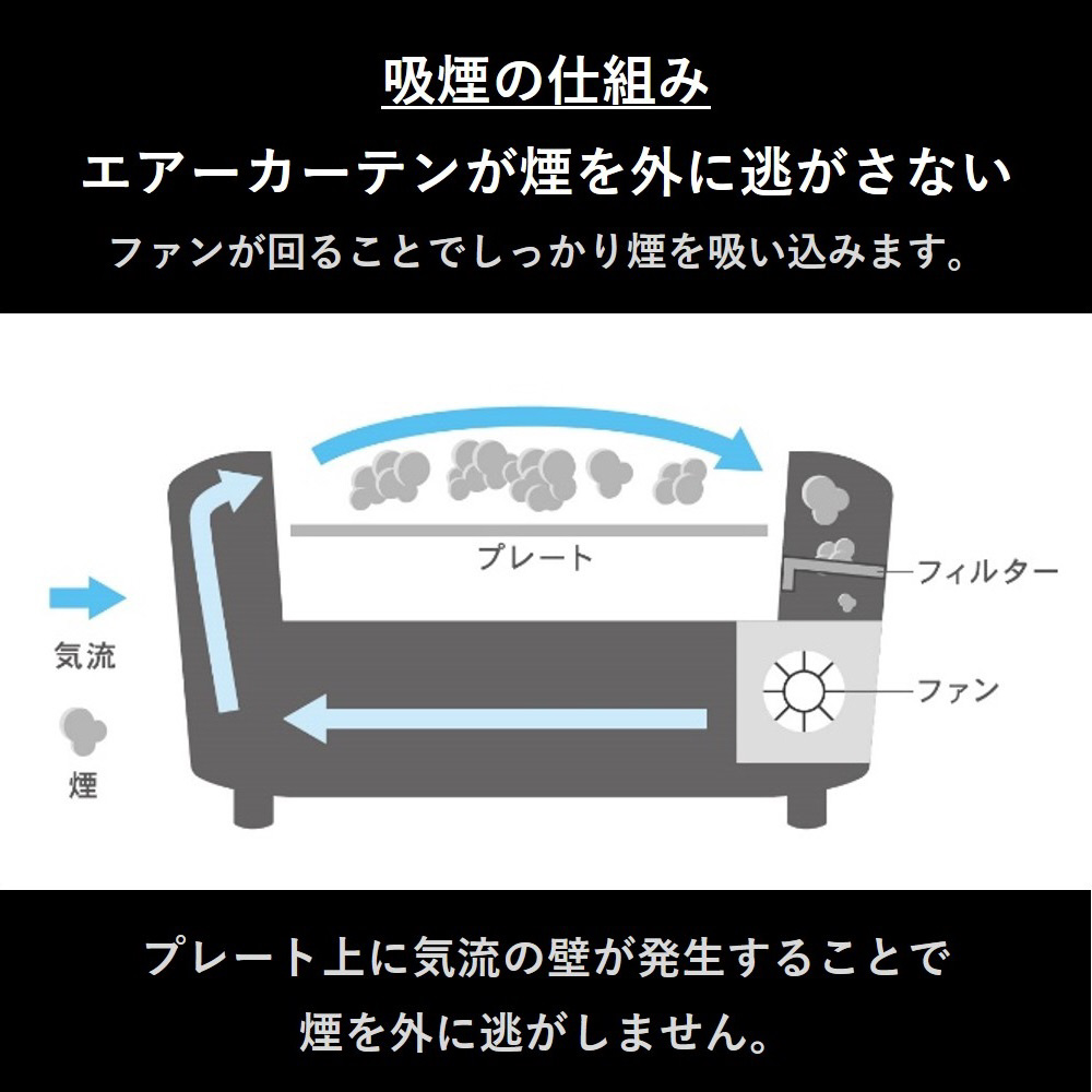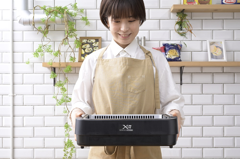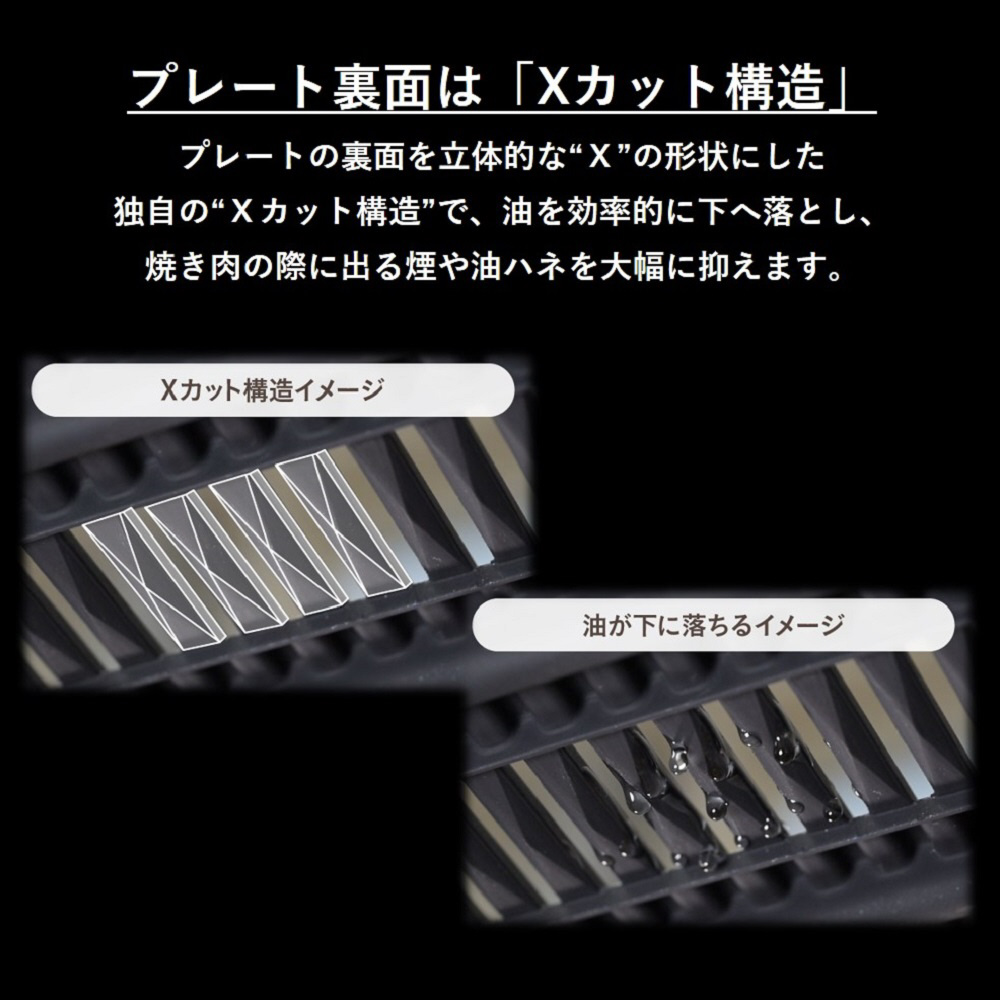プレートの裏面を立体的な“X”の形状にした独自の“Xカット構造”で、油を効率的に下へ落とし、焼き肉の際に出る煙や油ハネを大幅に抑えます。