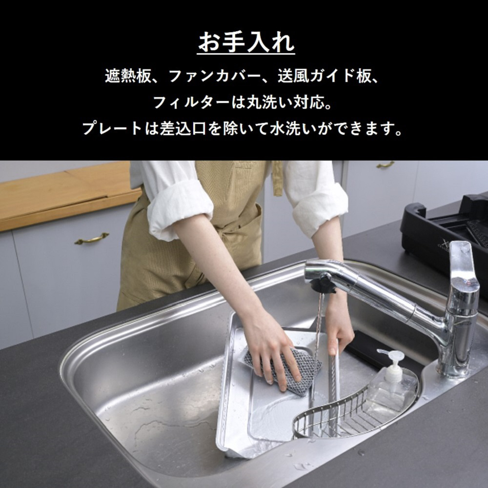 使用後のプレート、ファンユニット、遮熱板などは取り外しが可能で、分解して洗えるため、いつでも清潔に使えます。