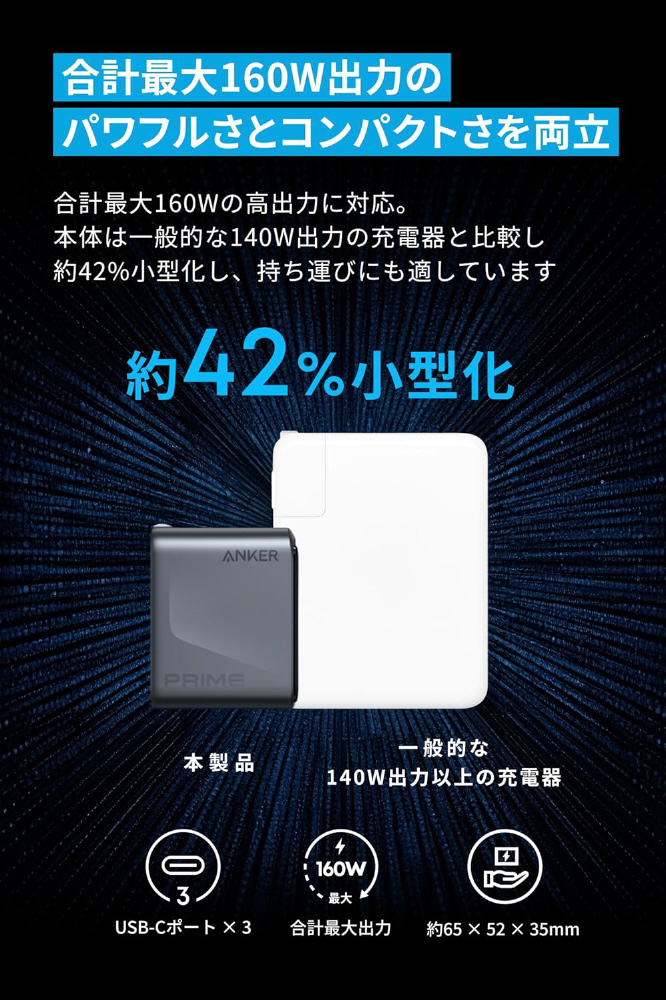 合計最大160Wの高出力に対応。本体は一般的な140W出力の充電器と比較し約42%小型化し、持ち運びにも適しています。