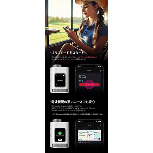 Bluetoothでアプリからデータを取得、または事前にデバイスにデータをインストールしておくとコースレイアウト・グリーン情報を確認できます。